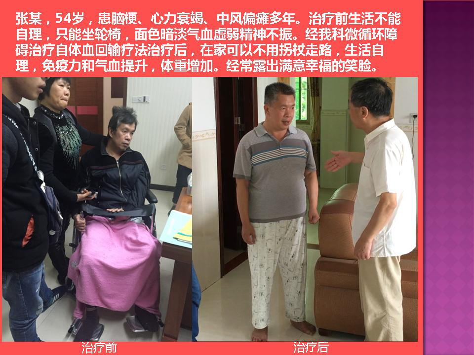 微循环障碍自体血回输治疗法是一个崭新的医学概念,是一种领先国际的专利绿色治疗法。它源于许多疾病的微循环障碍,融血液生理学、微循环学、激光量子医学、高压氧医学、磁疗学为一体,它使用一整套仪器设备和活血去瘀通络的纯天然中药相结合的独特手段,把饱含细菌、病毒、高粘、高脂的血液改造成高氧、高能量、高营养的健康纯净血液,迅速改善全身组织的供血供氧功能;降低血脂和血粘度,把流速较慢的血液改造成流速较快的血液;把老化呆滞、缺乏活力的血液改造成年轻活化具有活力的血液;如同把黄河水改造成长江水,水流清澈,河道自然通畅。使血液红细胞变形能力增强、血液中氧自由基及酸性代谢产物减少,增加新陈代谢,并能改善机体的免疫功能,增加免疫细胞的活力。微循环障碍治疗法适应症非常广泛,有病治病无病保健预防。