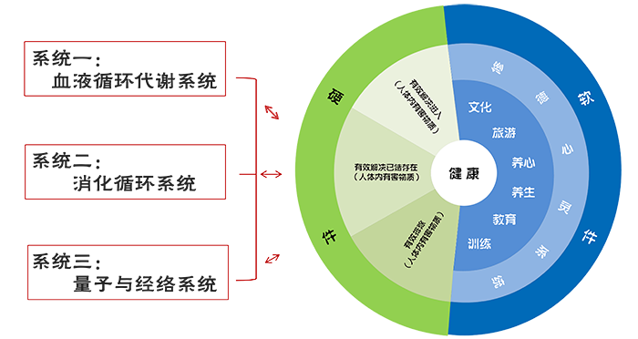根据自然生态(易理)原理,整合人类医学、量子科学及自然法则,围绕空气、阳光和水及易理,并根据以人的 血液循环代谢系统、消化循环系统、经络系统 为主导的解决方案,达成无病先养,有病自然养,生态养生、自然养生、文化养生,以创新医养理论和实践解决大众健康。