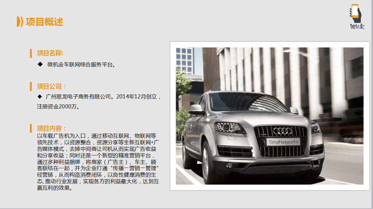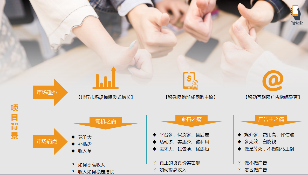 以车载广告机为入口,通过移动互联网、物联网等领先技术,以资源整合,资源分享等全新互联网+广告媒体模式,去掉中间商让司机从而实现广告收益和分享收益;同时还是一个新型的精准营销平台,通过多种利益捆绑,将商家(广告主)、车主、顾客联结在一起,并为企业打通“传播—营销—管理”经营链,从而构造消费闭环,以良性健康消费的生态,推动行业发展,实现各方的利益最大化,达到互赢互利的效果。